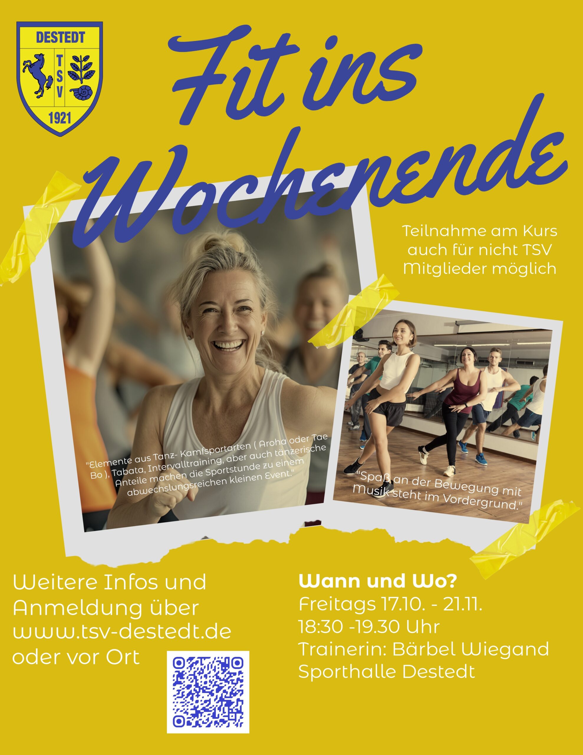 Die/ der Ein oder Andere wird sich hier und da auch an Aerobic- Kurse aus alten Zeiten erinnert fühlen. Gemeinsam Schwitzen und Spaß haben in einer positiven und angenehmen Atmosphäre, z. Teil auch mit Geräten- dies ist der Tenor von „Fit ins Wochenende“.